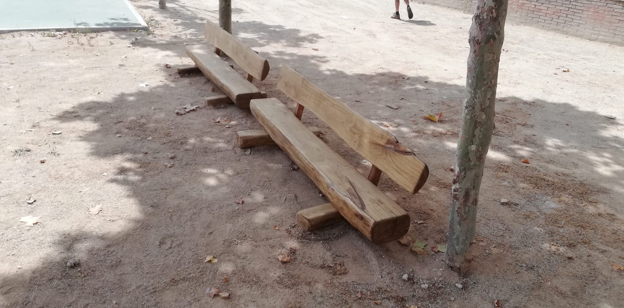 Tronc amb respatller de fusta d’acàcia fixat al terra i tractat amb lasur.